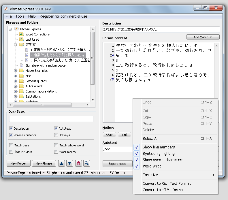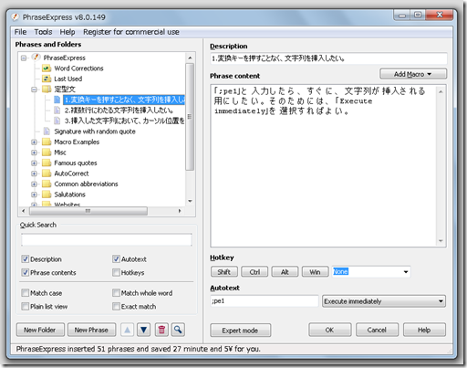 PhraseExpress、数歩前進。変換キーを押さずに挿入&数行にわたる文字列挿入の設定方法。