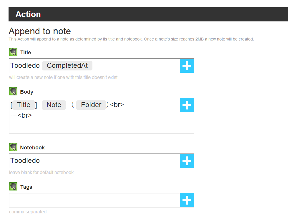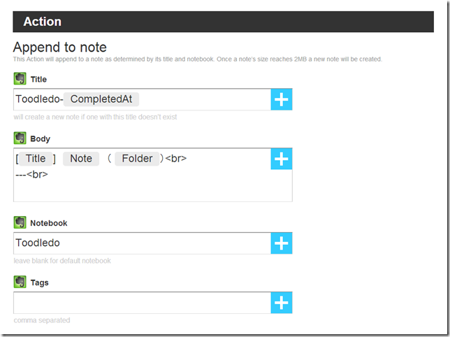 もし、Toodledoで何らかのタスクが完了になったら、そのときは、Evernoteの「Toodledo-{{完了日}}」という名前のノートに、完了にしたタスクを追記する