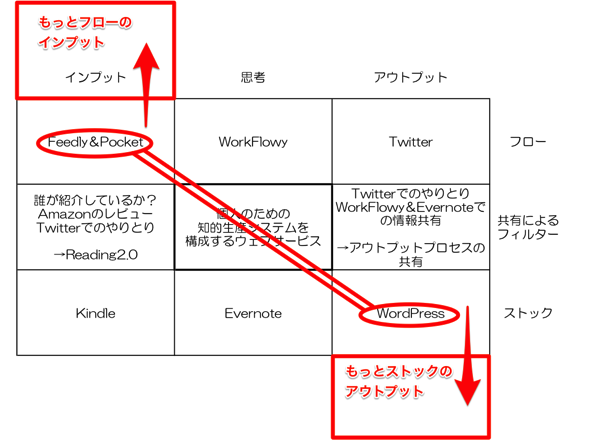 - 「Kindle」→「WorkFlowy」→「WordPress」という流れは、読書の収穫を高めるためにすごく有効な流れだけれど、せっかくなら、「Kindle」→「Reading2.0」→「Feedly&Pocket」→「WorkFlowy」→「Twitter」→「アウトプットプロセスの共有」→「WordPress」→「Evernote」という流れを組み立てると、もっと収穫が増えるかもしれない。