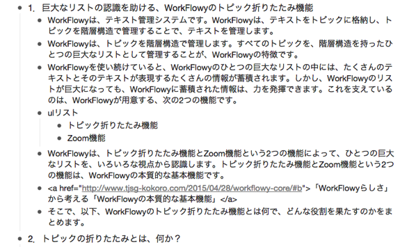 実際、トピック「(1) WorkFlowyは、トピックを階層構造で管理したリスト」の折りたたみを解除すると、こうなりました。