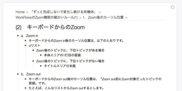 WorkFlowyはテキスト管理システムなので、文字入力のためのカーソル位置は、非常に大切です。また、連続してZoom機能を使う場合、Zoom機能直後にトピック移動機能を使う場合など、Zoom後のカーソル位置が大切になる場面は、多々あります。