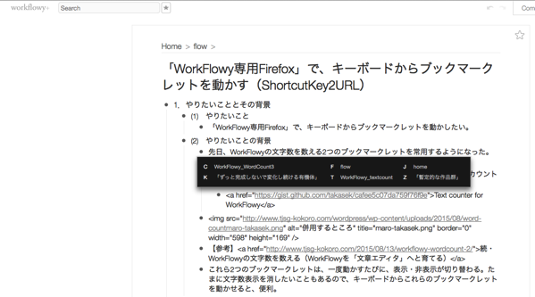「WorkFlowy専用Firefox」で、キーボードからブックマークレットを動かしたい。